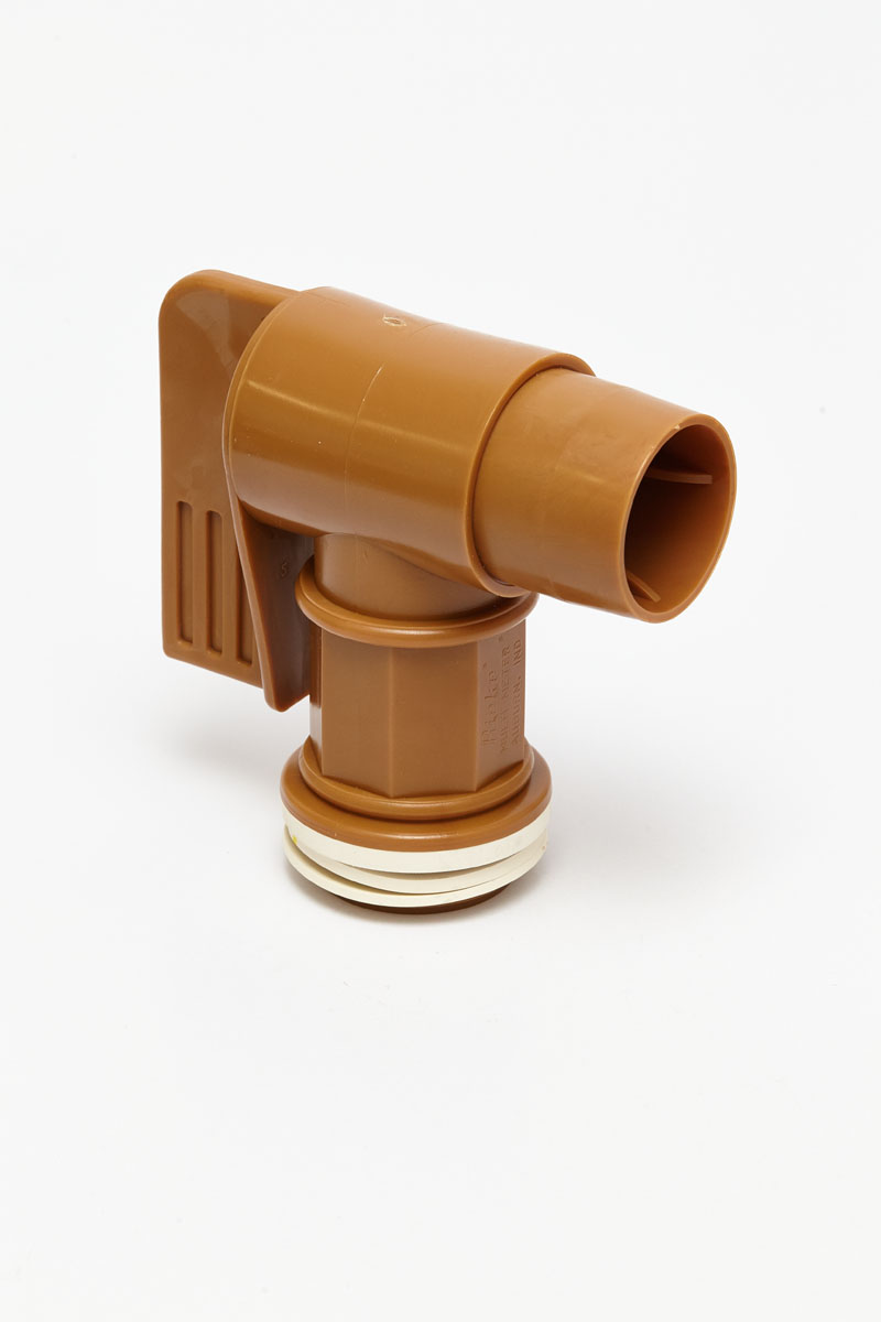 The Flo-King faucet is 100% FDA polyethylene construction. This gold color faucet fits 2 inch bungs and has a large 2 inch bore for fast flow of liquids.